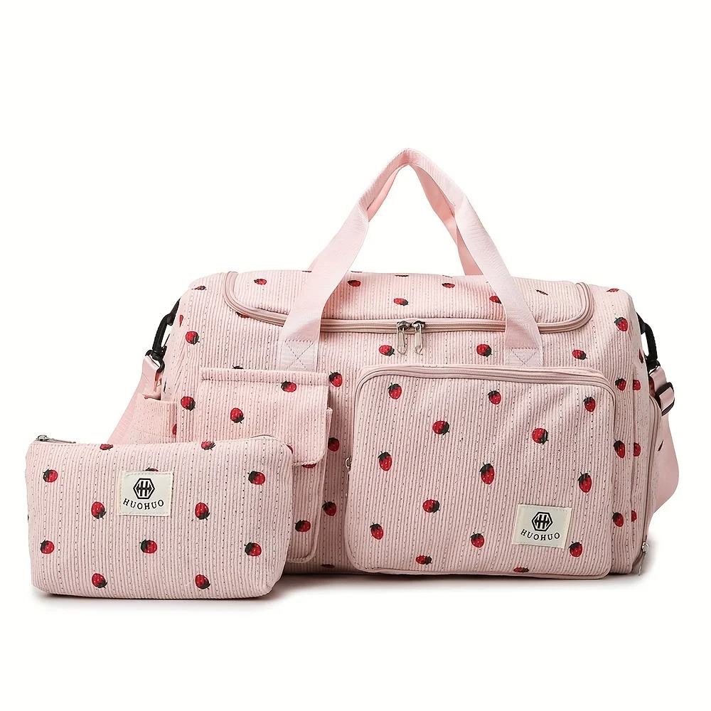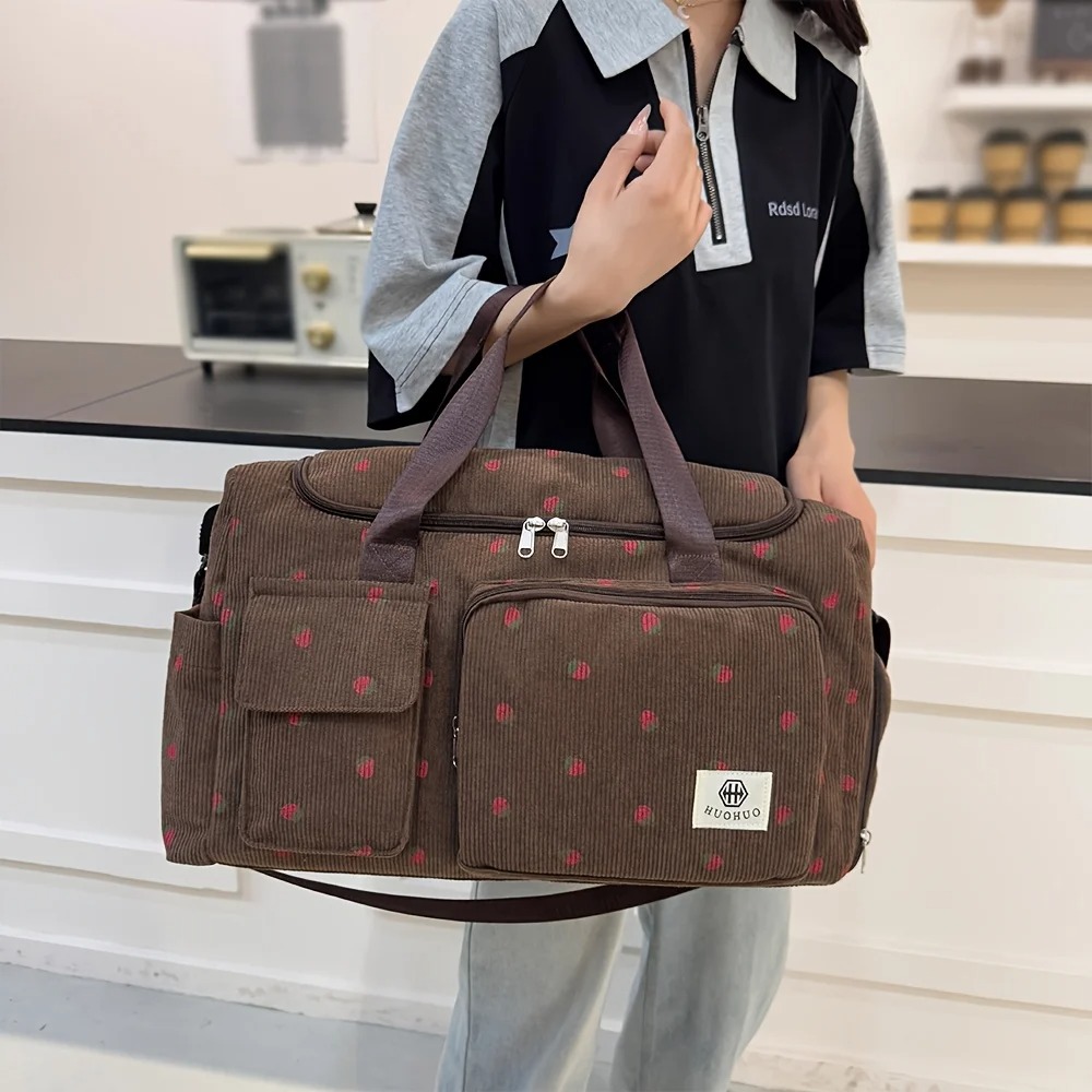 Spice up your travel with this Strawberry Print Corduroy Weekender Bag! Large capacity yet lightweight, perfect for gym sessions, overnight trips, or sports activities. Features a comfortable crossbody strap, durable corduroy fabric, and multiple compartments for easy organization of your essentials. Stylish, fun, and practical – your go-to bag for everyday adventures.
